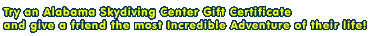 You can give a friend a Tandem FREEFALL SKYDIVE! You can do it right over the phone! Just call us toll free at 205-SKY-DIVE(759-3483). We can process your credit card order and mail your certificate out promptly.